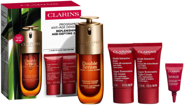 Das Set enthält Double Serum in einer 50 ml Originalgröße und zum Kennenlernen die Tages- und Nachtcremes der Pflegelinie Extra-Firming, die auf die Bedürfnisse der Haut ab 40 Jahren perfekt abgestimmt ist. Double Serum zielt auf die Zeichen der Hautalterung, die mit dem natürlichen Alterungsprozess zusammenhängen, sowie diejenigen, die durch den Lebensstil und die Umwelt verursacht werden. Double Serum ist inspiriert von der Wissenschaft der Epigenetik und bekämpft dank der einzigartigen Epi-Ageing Defense Technology die Zeichen der Hautalterung, die durch den Lebensstil verursacht werden. Seine einzigartige Doppelformel, die zu 95 % aus natürlichen Inhaltsstoffen besteht, kombiniert 22 leistungsstarke Pflanzenextrakte, darunter den ikonischen Curcuma-Extrakt, mit 5 neuen reinen aktiven Molekülen, um die 5 Vitalfunktionen der Haut (Regeneration, Nährstoffversorgung, Sauerstoffversorgung, Feuchtigkeitsversorgung und Schutz) zu stimulieren. Die straffenden Tages- und Nachtcremes ergänzen die Anti-Age Pflegeroutine perfekt für eine sichtbar jugendliche Haut.