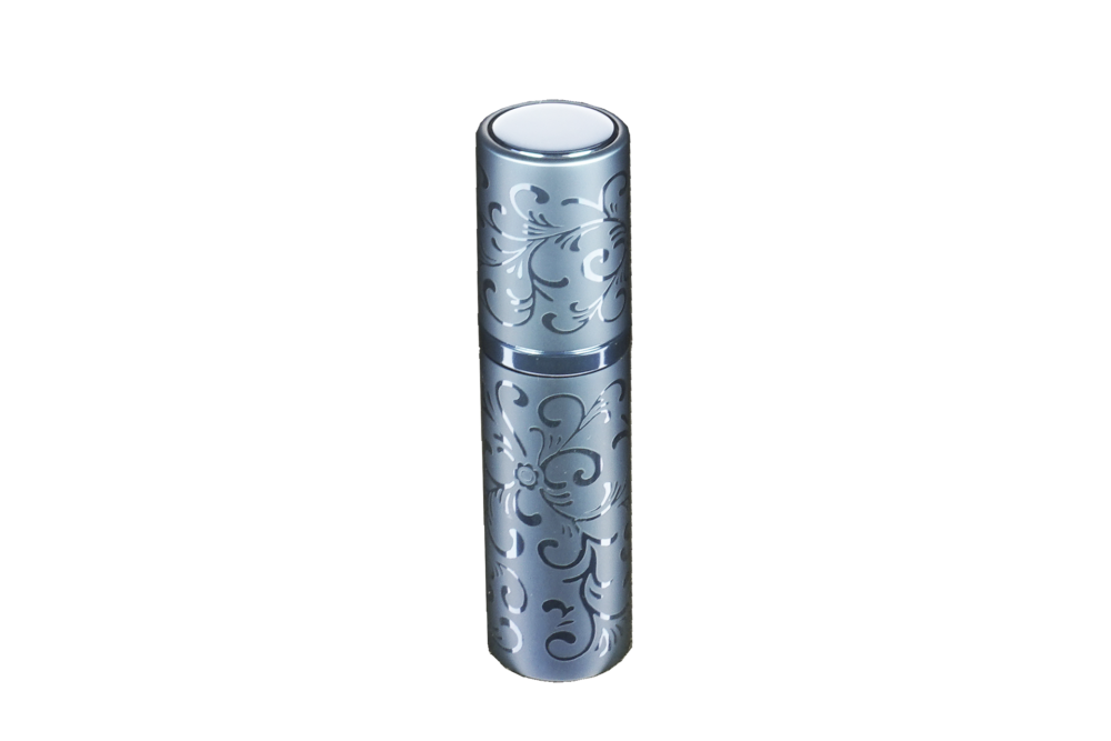 Ist er nicht schön? Parfumzerstäuber mit wunderschönem Blumendekor. Das Besondere: drehen Sie die obere und untere Hälfte gegeneinander und der Sprühkopf wird sichtbar. Diesen können Sie nun einfach herausziehen zum Füllen. Danach den Glaseinsatz zurückstellen und mit Drehungen der beiden Häften wird der Sprühkopf wieder versenkt. Sicher und sauber für unterwegs! Aluminium mit Glaseinsatz. Für 8 ml Inhalt, leer.
