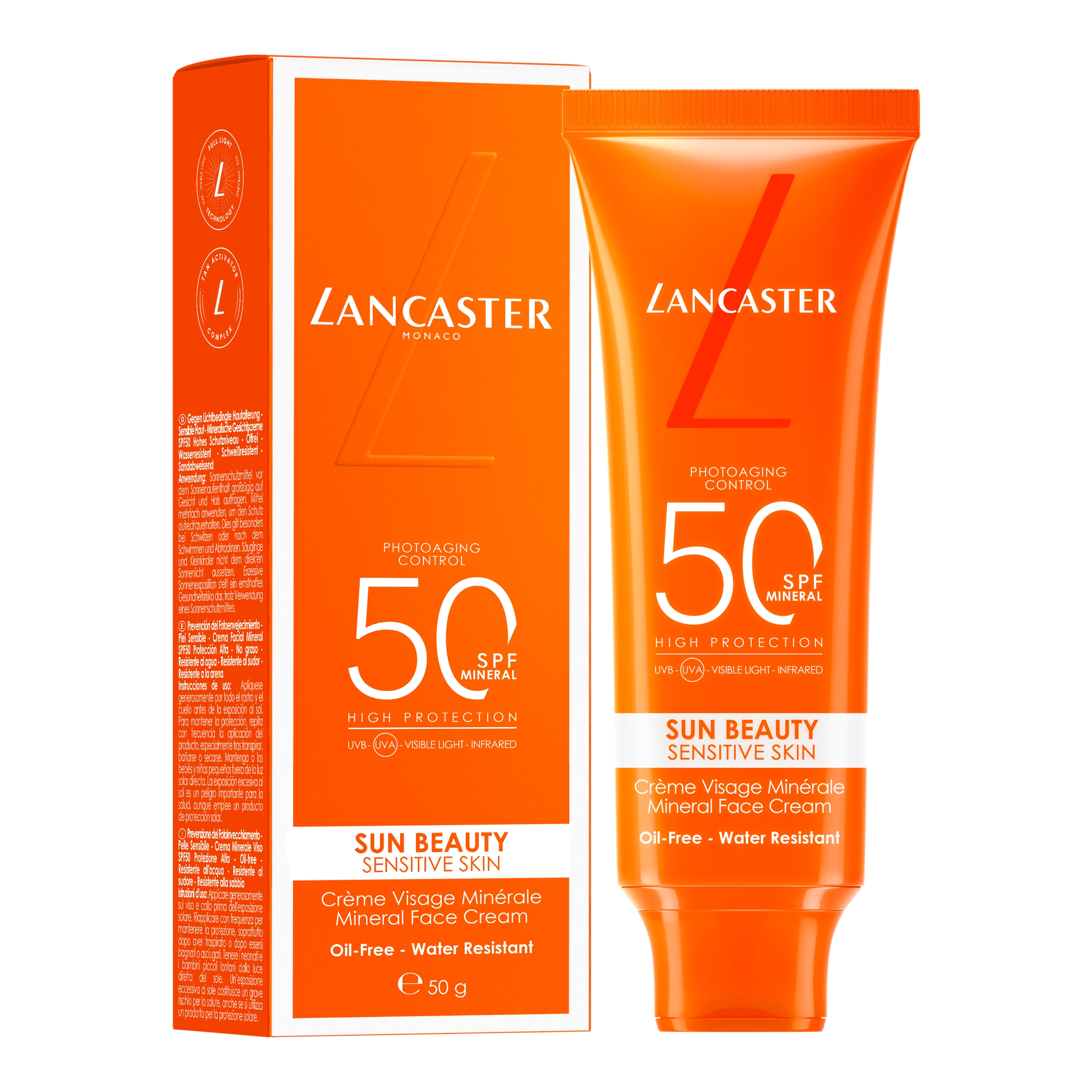 Die Sun Beauty Sensitive Skin Mineral Face Cream SPF50 von Lancaster, der Nr. 1 Prestige-Sonnenschutzmarke in Europa1, schützt die Haut über herkömmlichen UV-Schutz hinaus. Unser umfassendster, für empfindliche oder leicht reizbare Haut geeigneter Sonnenschutz mit 100 % mineralischen Filtern. Die Einwirkung von Sonnenlicht ist für 80 % der sichtbaren Alterungsanzeichen2 verantwortlich, ein Prozess, der als lichtbedingte Hautalterung bekannt ist. Da UVA- und UVB-Strahlen nur 10 % des Sonnenspektrums ausmachen, geht unsere Formulierung über herkömmlichen Sonnenschutz hinaus und schützt vor sichtbaren Licht- und Infrarotstrahlen. Unsere Full-Light TechnologieTM bietet einen 10-mal umfassenderen Sonnenschutz*. 1Insgesamt, 5 europäische (FR, DE, UK, IT & ES) Prestigemärkte & -marken. In Wert & Einheiten, 2017 bis Juni 2024. Circana Group L.P/BeautyTrends®. 2Die Weltgesundheitsorganisation & Yale Medicine, Studie zu lichtbedingter Hautalterung.