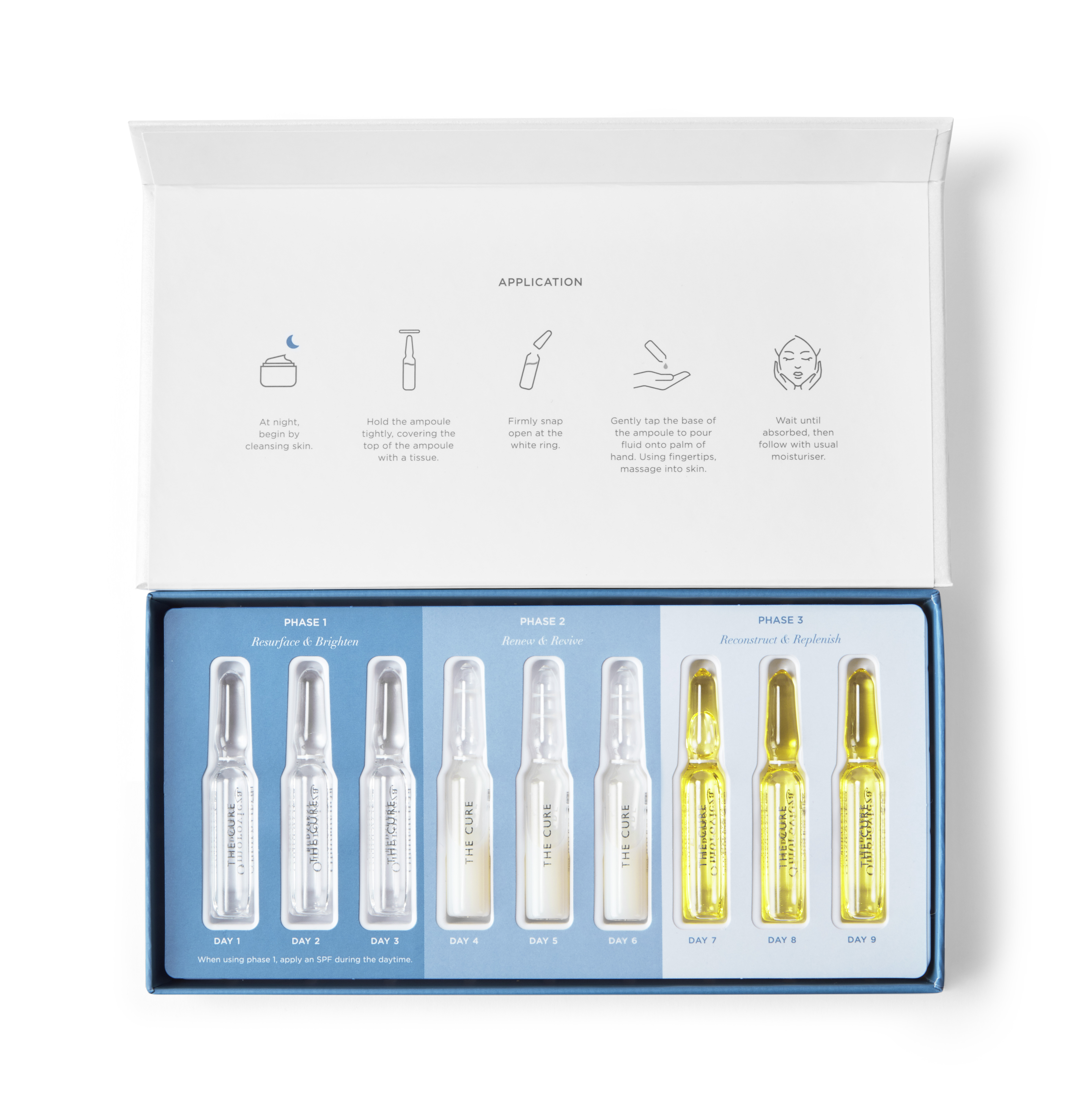 The Cure besteht aus drei verschiedenen Phasen, die jeweils drei Tage dauern. An neun aufeinander folgenden Tagen wird je eine Ampulle jeden Abend nach der Reinigung verwendet.